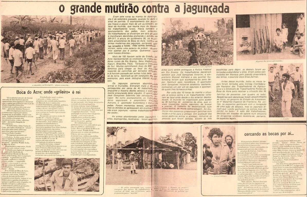 Às sete horas da manhã de domingo, 2 de setembro de 1979, foi dado o sinal de partida. Mais de 300 trabalhadores rurais avançaram em marcha firme pela rodovia BR-317, na altura do quilômetro 38, no município amazonense de Boca do Acre. À frente deles, apenas terçados e foices. A pouco mais de um quilômetro, estava o acampamento dos jagunços armados, contratados para expulsar posseiros da área. Mais próximo ainda, o acampamento dos peões que operavam motosserras.